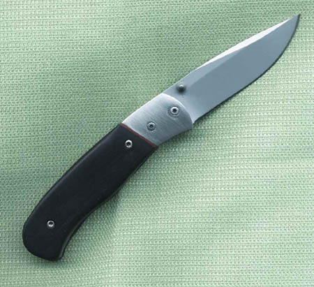 Die Griffschalen sind aus Ebenholz, zwischen Edelstahlbacken und Holz ist eine Zwischenlage aus rotem Fiber.