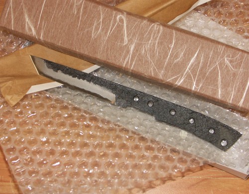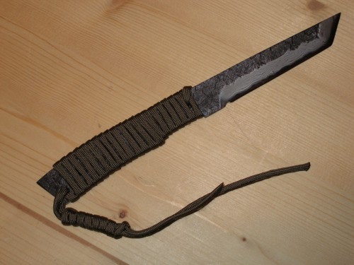 handgeschmiedetes Damasttanto aus 15 Lagen mit einer blauen Papierstahlschneidleiste Gesamtlänge: 21,5cm